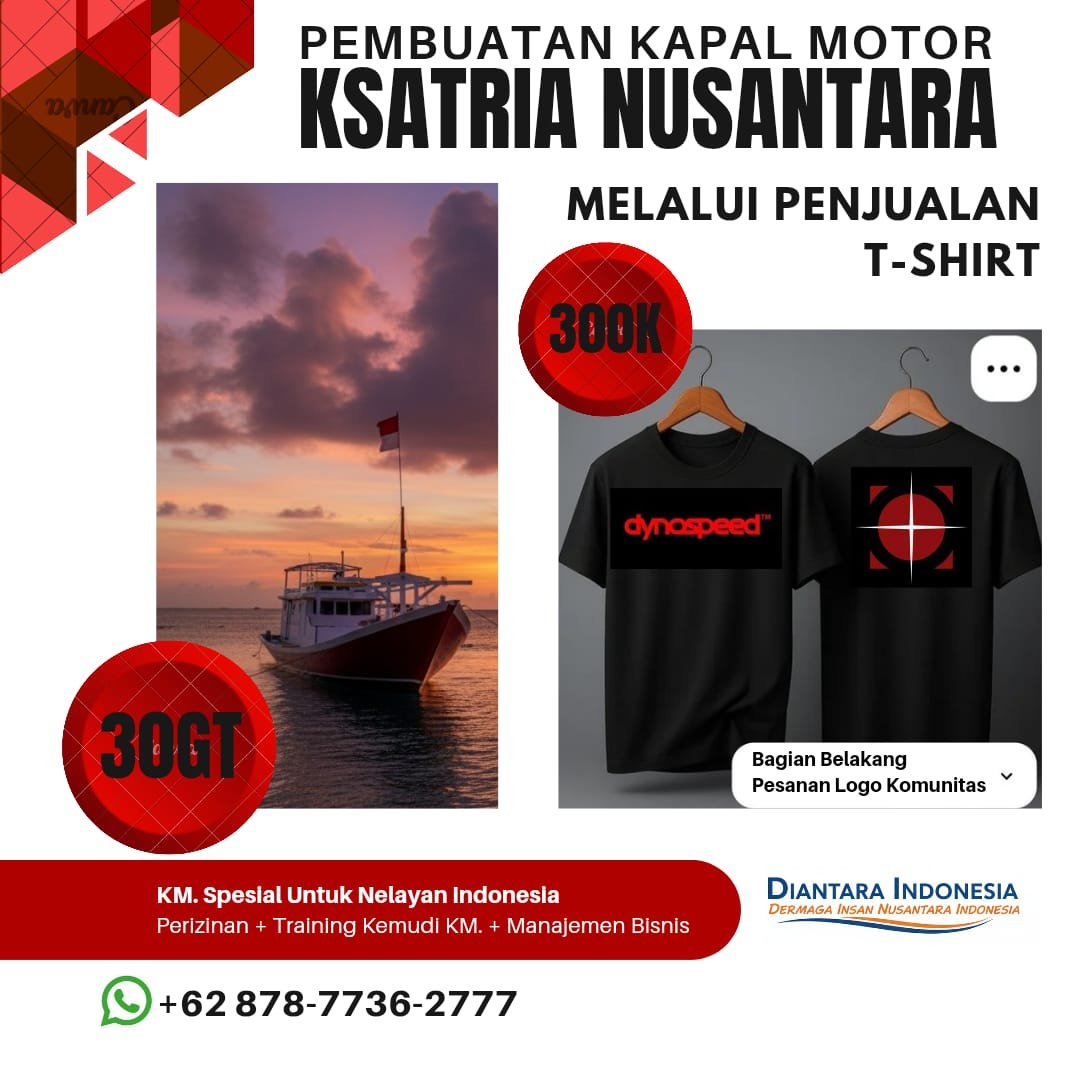 JAKARTA – Penjualan T-Shirt DYNOSPEED menjadi bagian dari upaya nyata mendukung kehadiran Kapal Motor (KM) Ksatria Nusantara GT 30, yang dirancang khusus untuk diberikan kepada nelayan. Kapal tersebut rencananya akan diproduksi di kawasan Kalibaru, Jakarta Utara.